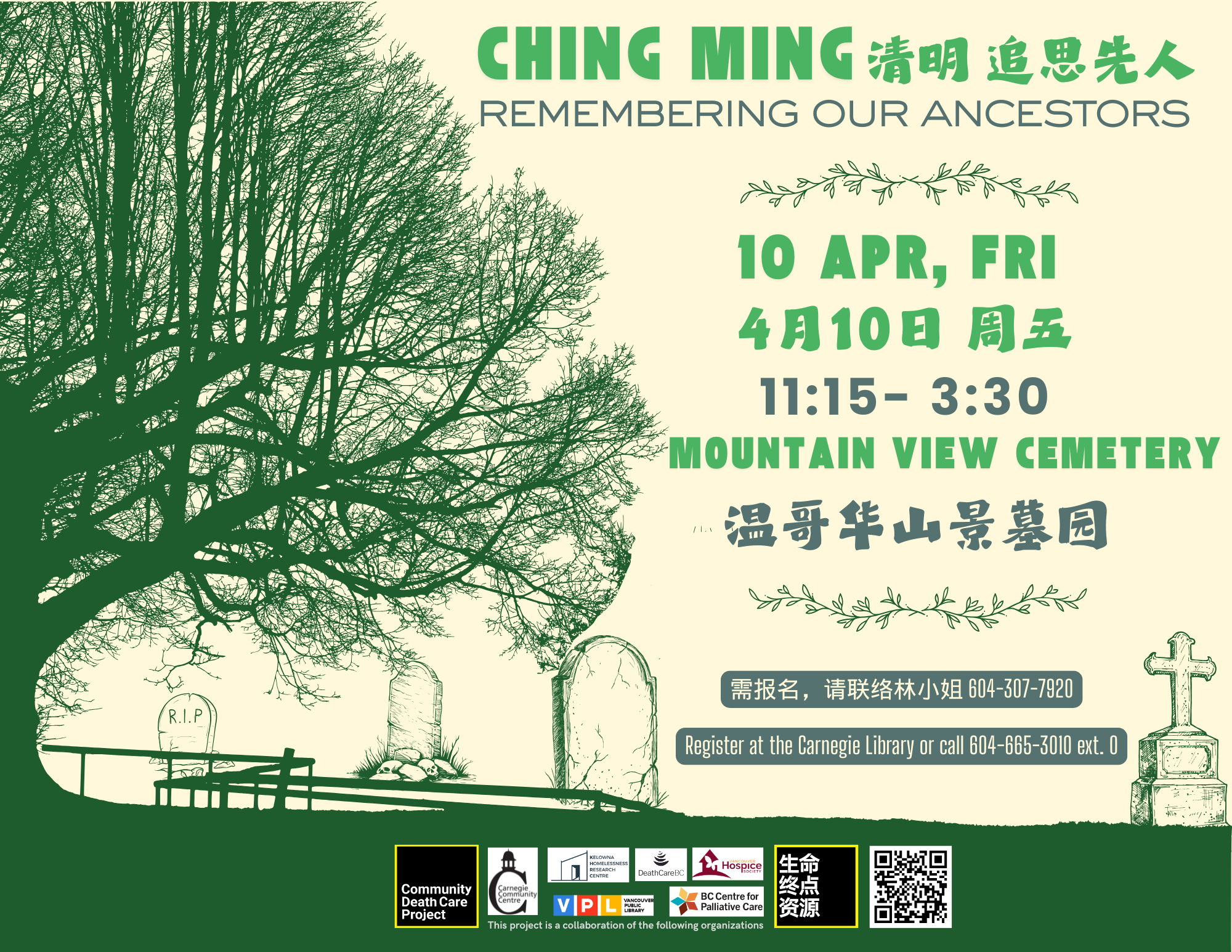 10 Apr, Friday | 4月10日 周五 11:15 am - 3:30 pm |上午 11:15至下午3:30 Gather @ Seniors Lounge | 请当天到长者室集合 Join us at Mountain View Cemetery to honour and remember our ...