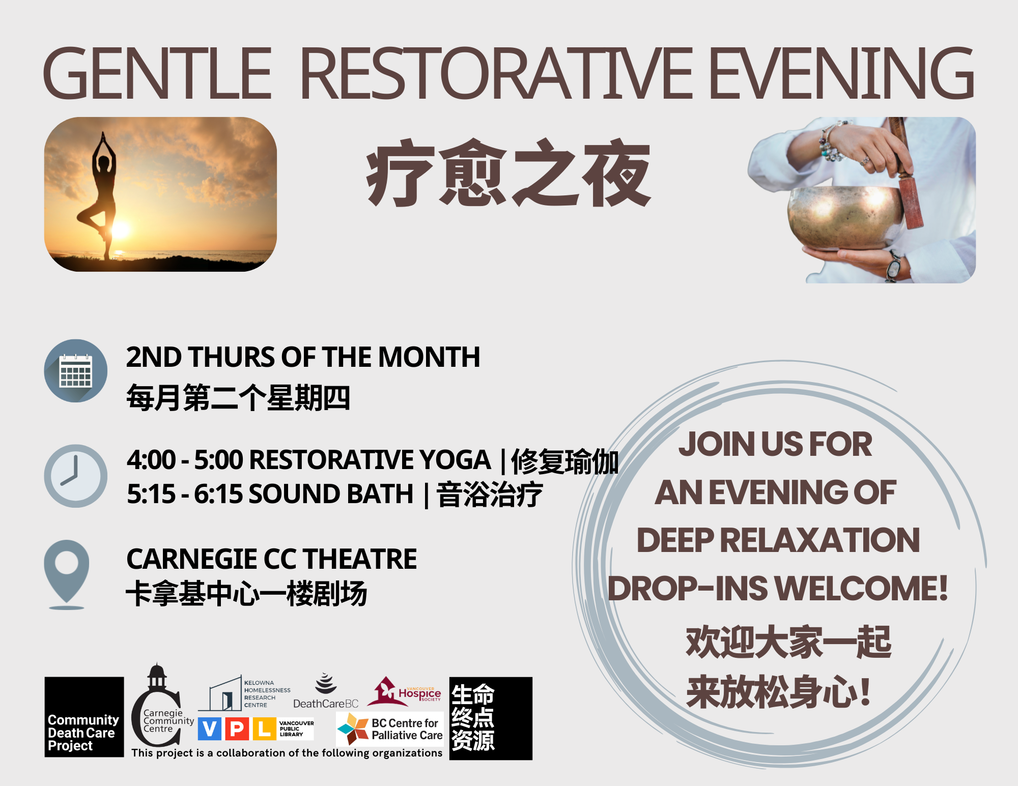 4:00 pm Yoga | 4:00 修复瑜伽 5:15 pm Sound Bath | 5:15 音浴治疗 Theatre @ Carnegie CC Main Floor | 卡拿基中心一楼剧场 Drop-ins are welcome! | 无需报名 Join us for an ...